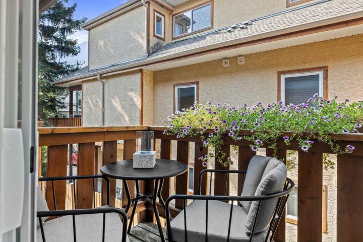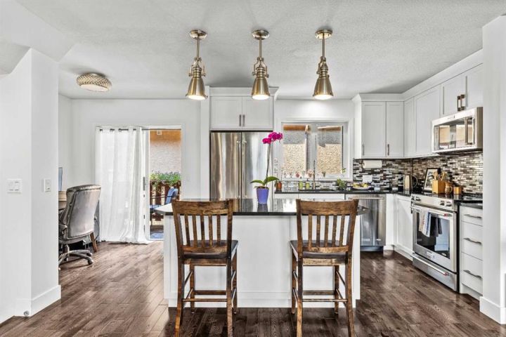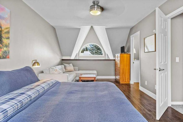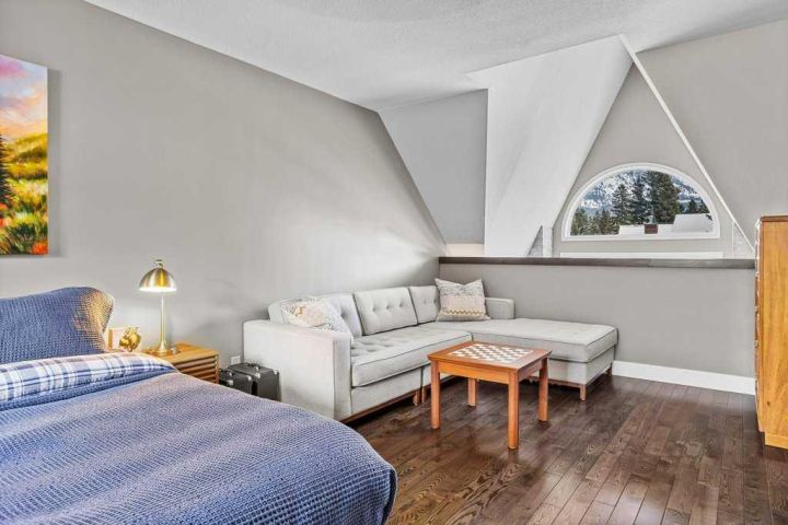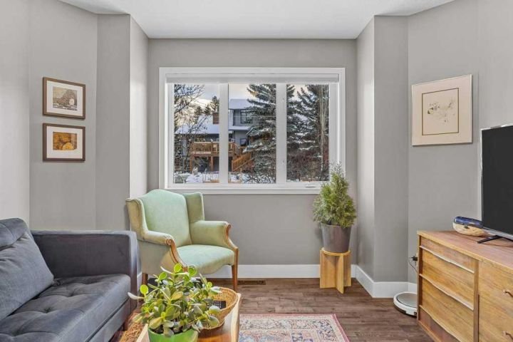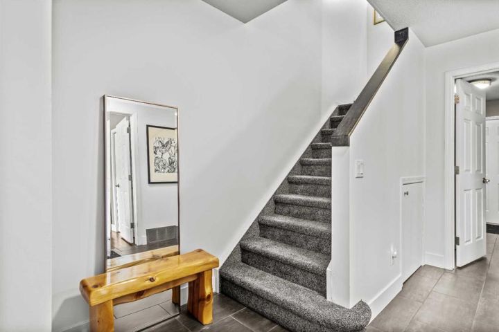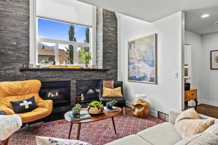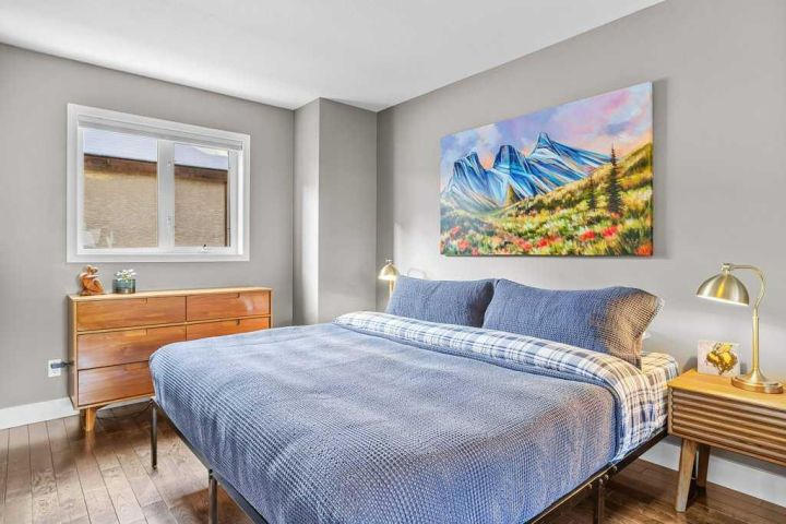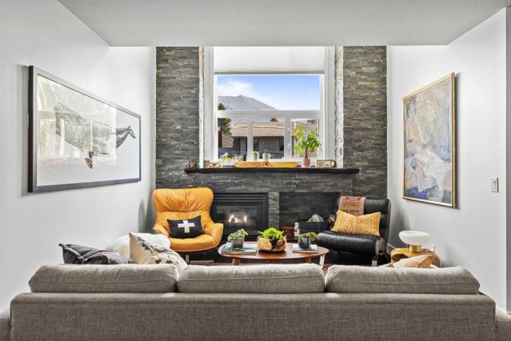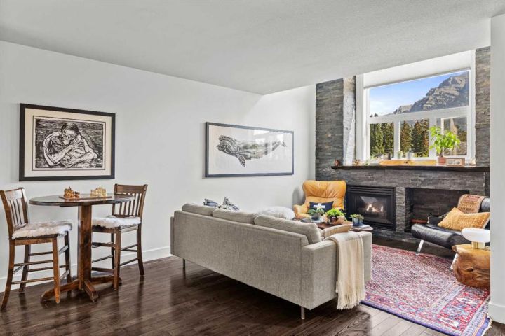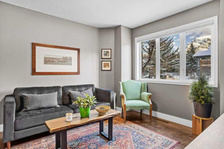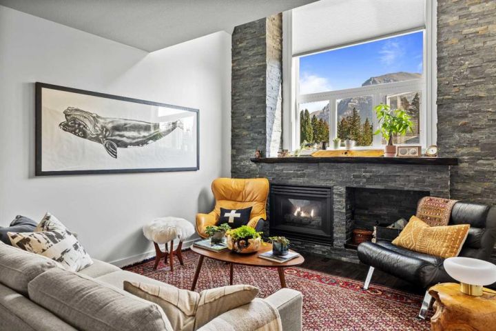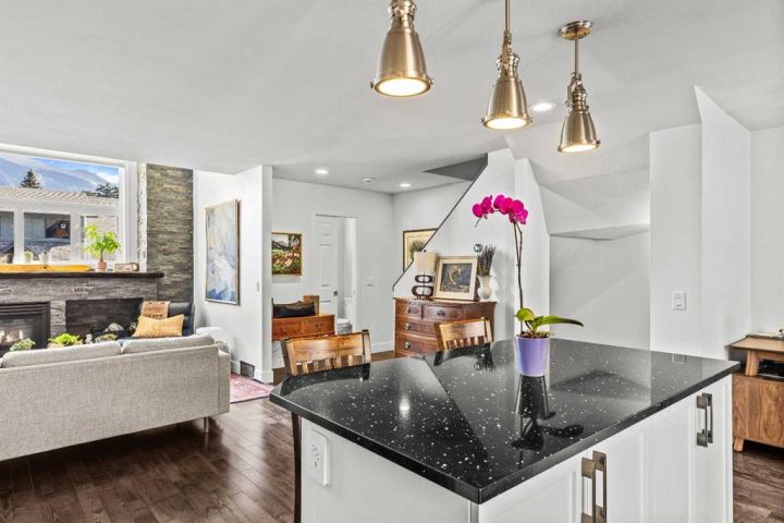 Welcome to this stunning 3-bedroom, 3-bathroom townhome, ideally situated in the heart of Canmore. Just steps from shops, schools, parks, and endless trails, this home offers the perfect combination of comfort and convenience in an unbeatable location. With many updated upgrades throughout, it blends mountain charm with refined, modern touches. The spacious primary suite is filled with natural light and features a generous walk-in closet along with a beautifully appointed ensuite complete with heated floors. The main living area features an open-concept design with rich ash hardwood flooring, a chef-style kitchen with quartz countertops and stainless steel appliances, and a cozy gas fireplace framed in elegant stonework beneath vaulted ceilings. Large picture windows capture sweeping mountain views.The ground level includes two additional bedrooms, a full bathroom, a practical laundry and mudroom, and a welcoming entryway into this stylish home.