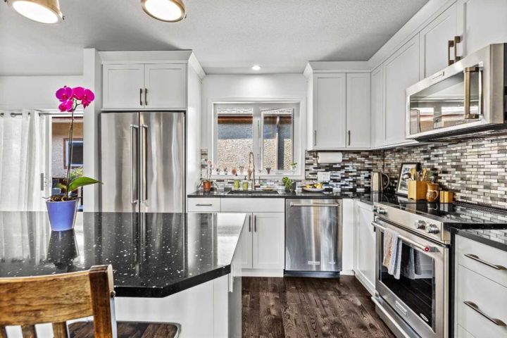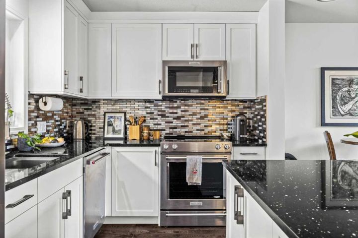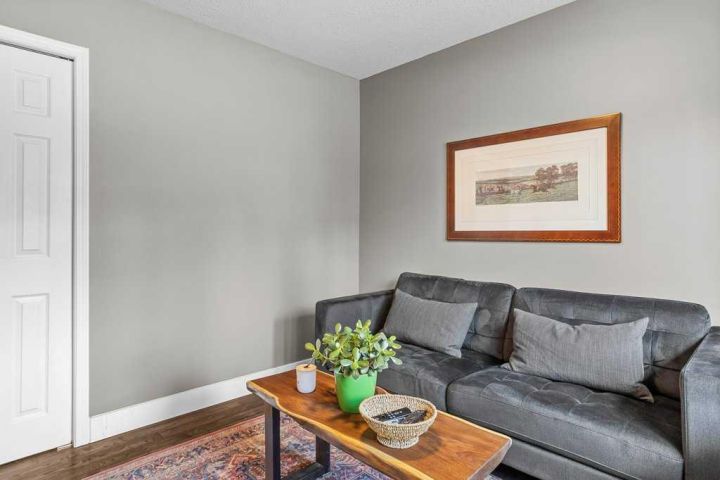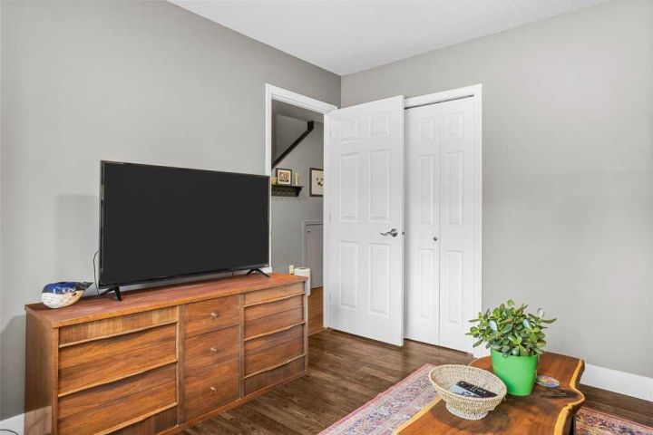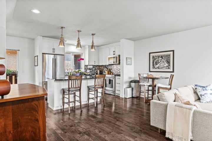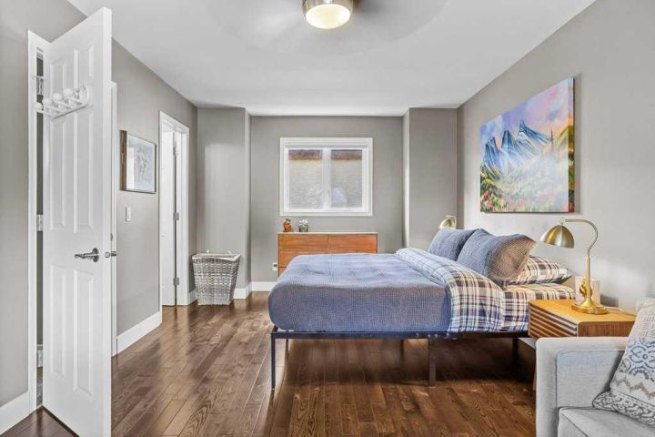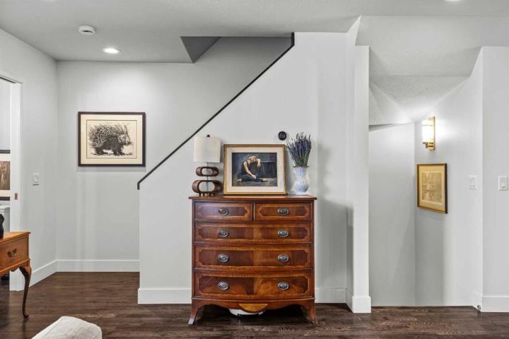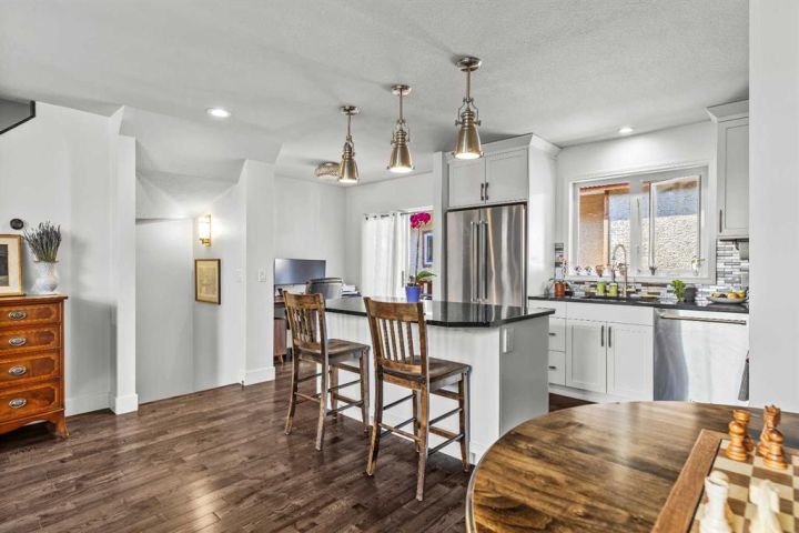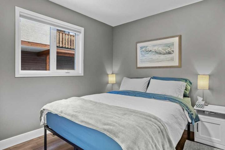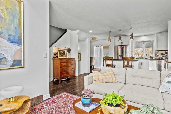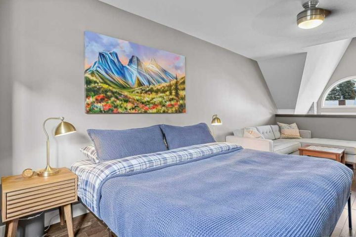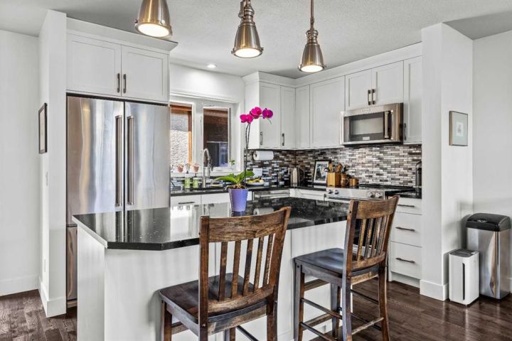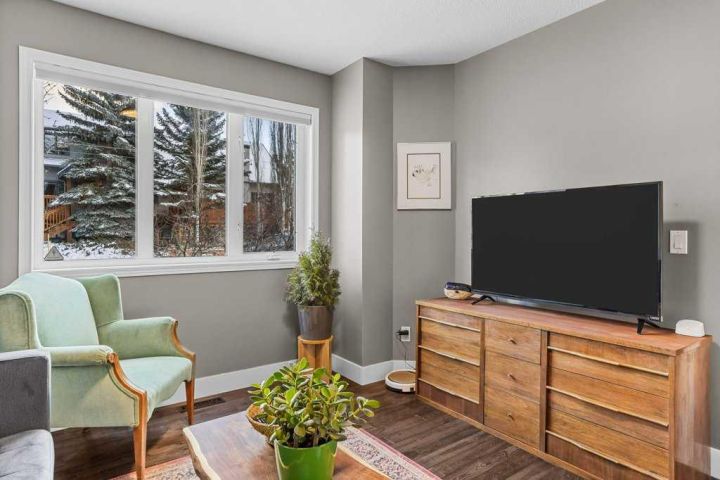 Welcome to this stunning 3-bedroom, 3-bathroom townhome, ideally situated in the heart of Canmore. Just steps from shops, schools, parks, and endless trails, this home offers the perfect combination of comfort and convenience in an unbeatable location. With many updated upgrades throughout, it blends mountain charm with refined, modern touches. The spacious primary suite is filled with natural light and features a generous walk-in closet along with a beautifully appointed ensuite complete with heated floors. The main living area features an open-concept design with rich ash hardwood flooring, a chef-style kitchen with quartz countertops and stainless steel appliances, and a cozy gas fireplace framed in elegant stonework beneath vaulted ceilings. Large picture windows capture sweeping mountain views.The ground level includes two additional bedrooms, a full bathroom, a practical laundry and mudroom, and a welcoming entryway into this stylish home.