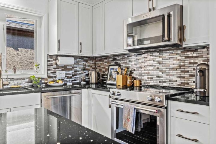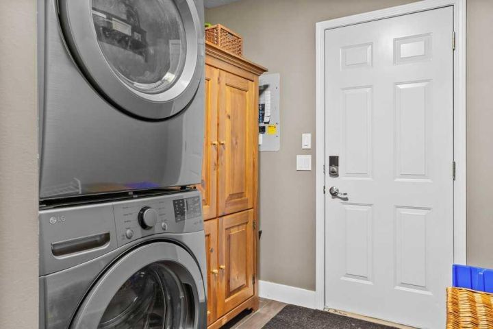 Dishwasher, Electric Range, Microwave Hood Fan, Refrigerator, Washer/Dryer Stacked