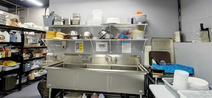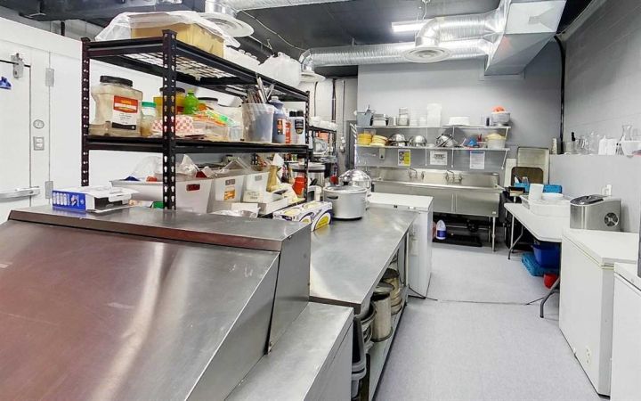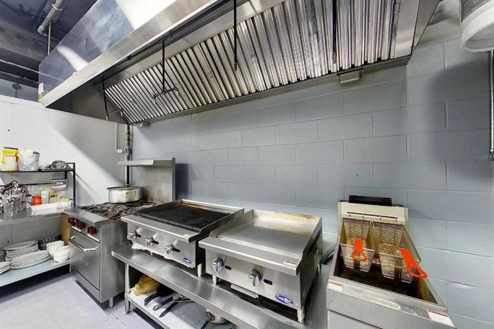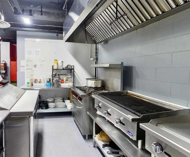Range ( 36", 6 open burners), Gas Floor Fryer, Griddle Gas Countertop, Charbroil Gas Countertop, Ventilation System ( Length 144" Height 20"), Walk In Cooler, Prep Table/Cooler, 3 Deep Freezer, 3 Compartment sink, 1 refrigerator, 2 microwave