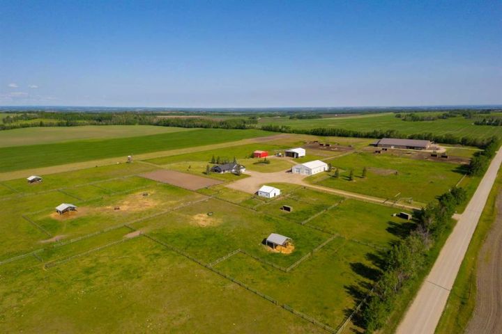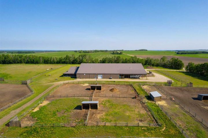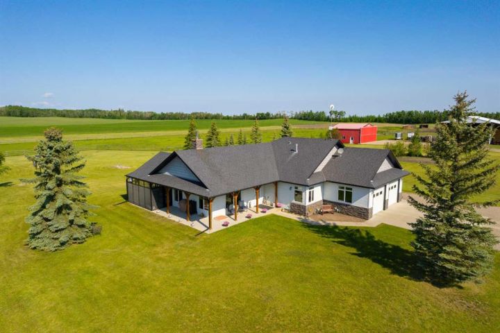 Welcome to this immaculate 153-acre property in Red Deer County, just 12 minutes NW of Olds, less than an hour to Calgary and 30 minutes to Red Deer. The main home is a 1,667 sq ft bungalow with a double heated attached garage. Inside, you’ll find three bedrooms on the main floor, including a spacious primary suite with a four-piece ensuite, plus another full bathroom and a well-appointed laundry room with access to the garage. The open-concept kitchen, dining, and living area is bright and inviting, with large windows offering stunning views from every angle. The kitchen features warm wood cabinetry and a large island, while the living room adds a cozy charm with its wood-burning stove. Hunter Douglas blinds are installed throughout for comfort and efficiency. A screened-in sunroom with a patio door and fully opening windows provides a peaceful space to enjoy the views and all four seasons. The finished basement includes another bedroom, a three-piece bathroom, a large rec room and a hobby room. There is in-floor heat in the basement, instant hot water, and a 50-gallon automatic water heater. The home also has A/C. Equestrian or livestock amenities include a professionally built, insulated and heated 80x180 INDOOR RIDING ARENA with humidity control, four forced-air heaters, a 14x14 overhead door and air circulation fans. The arena ground footing was professional done. A roll-up door connects to the 20x120 BARN with in-floor and overhead heat , four soft-cushioned stalls, a wash bay, large tack room with a sink, and built-in saddle racks. A 20x60 lean-to adds more storage and shelter. The arena is monitored by seven professionally installed, Wi-Fi-compatible security cameras. Attached to the arena is a beautiful 1,701 sq ft home with a full wraparound veranda. It offers two bedrooms, including a generous primary suite with a five-piece ensuite and a massive walk-in closet, plus an office with a window overlooking the arena. The kitchen offers abundant cabinetry and a central island, while the dining area features patio doors and the living room boasts another cozy wood stove. A spacious mudroom/laundry room and ample storage throughout make this home as practical as it is charming. Outbuildings include a partially heated 60x90 SHOP, a heated 30x36 MAIN BARN with two stalls—one convertible to a foaling stall with a camera monitor—and a heated tack room with hot and cold water. The massive 70x43 hay shed holds up to 300 large square bales. Aviation lovers will appreciate the 42x36 airplane hangar with a bi-fold door, a tower and a private runway stretching nearly the full length of the quarter. The land is thoughtfully fenced with all-rail fencing—NO BARBED WIRE—and includes a mix of pasture and paddocks, including introduction pens, automatic waterers, and 2 OUTDOOR RIDING ARENAS. There are also 3 high producing water wells on the property. Approximately 80 acres of cultivated farmland with two dugouts complete this versatile and truly impressive property.