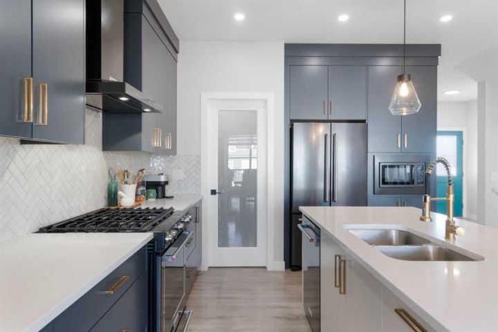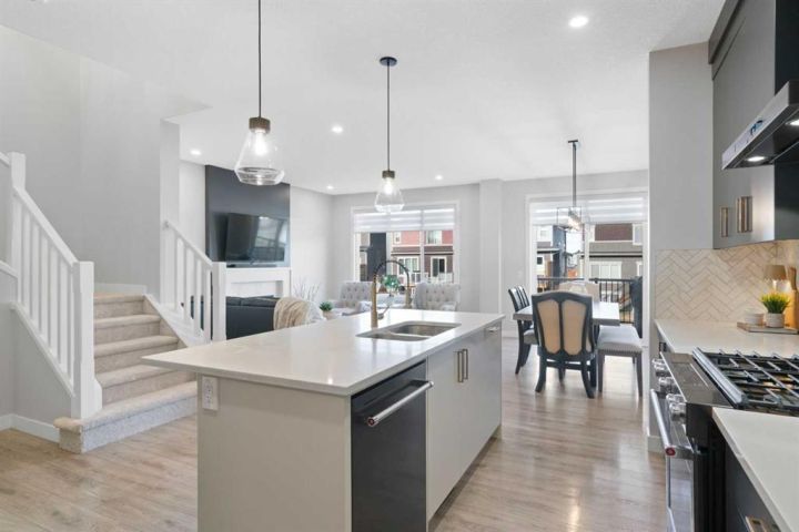 Welcome to this beautifully finished and thoughtfully upgraded Calbridge-built home backing onto a pathway and offering a blend of style, comfort, and functional living across all three levels. From the triple-pane windows to the fully developed sunshine basement, every detail has been selected to enhance everyday life. The main floor features a spacious front entry, 9 ft ceilings, fresh paint, a convenient 2pc bath, and an open-concept layout that is ideal for both family living and entertaining. The kitchen stands out with full-height dark grey/blue cabinetry, quartz countertops, herringbone tile backsplash, a large island, and KitchenAid dark stainless steel appliances including a gas range, and built-in microwave. The walk-in pantry provides exceptional storage with tons of shelving. The bright living room offers a gas fireplace with conduit to keep media wiring hidden and large windows that capture serene views of the backyard and pathway. The dining area comfortably fits a full-size table and leads to the back deck with BBQ gas line, stairs down to an exposed concrete patio, fresh mulch landscaping, storage under the deck, and a built-in cast iron firepit, perfect for relaxing or hosting. Upstairs, brand new carpet leads to a central bonus room with tray ceiling and pot lights. The primary suite feels like a retreat with vaulted ceilings, gimbal potlights, a feature wall, a large walk-in closet, and a 5pc ensuite including comfort-height double vanity with quartz counters, a soaker tub, and a tiled shower with niche. Two secondary bedrooms (one with a walk-in closet), a full 4pc bathroom with quartz countertops, and an upper laundry room with folding shelf complete this level. The fully finished sunshine basement is warm and inviting thanks to double-insulated walls and a dual-zone furnace, and includes a spacious recreation room, large bedroom with walk-in closet, 4pc bath with quartz counters, storage space, sump pump, and rough-in for radon. The double attached garage is plumbed and ready for utility use, making it ideal for future workshop needs. This is a move-in ready home where thoughtful upgrades, practical design, and location come together, set in a quiet, family-friendly area with direct pathway access right out your back door.