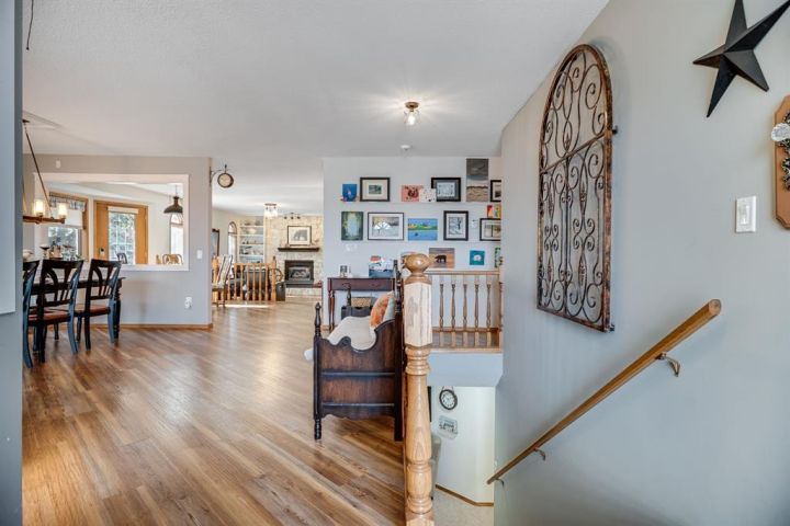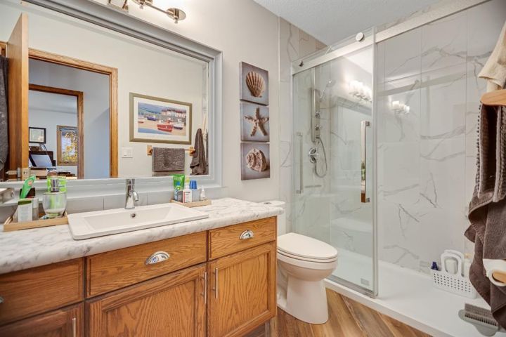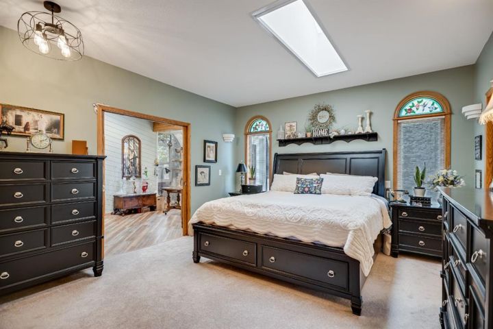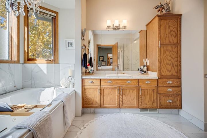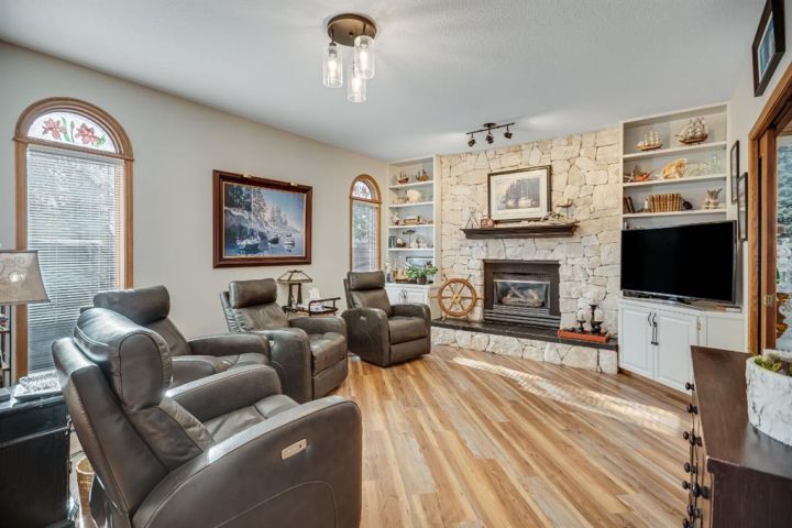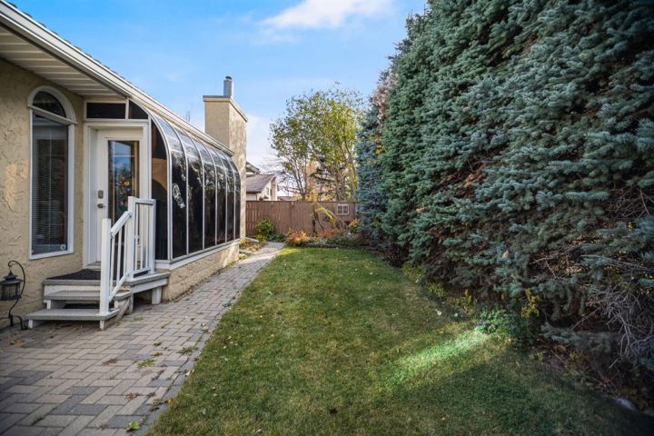 Experience the finest in living with this exceptional, fully finished 2367 sq ft bungalow across the street from Emerson Lake. Immaculately maintained and recently upgraded, this home boasts high-quality finishes, spacious, bright rooms, and a unique, welcoming layout you'll love. The main floor is an entertainer's delight, offering an open-concept living area, a formal dining room, and a cozy family room with a gas fireplace. It features a fantastic sunroom with a curved wall of windows and electric-shade-equipped skylights, plus a functional kitchen with a nook, updated appliances, and plenty of storage. The luxurious master suite is a true retreat with two exits, a walk-in closet, and a newly renovated 6-piece ensuite featuring a spacious glass shower and soaker tub. Two additional bedrooms (one an ideal office) and a dedicated laundry room complete the main level, all updated with new vinyl plank flooring, updated fixtures, and modern hardware. The fully finished basement expands your living space with a huge games room (pool table included!), a bedroom, an office, and a massive workshop/storage area with the comfort of in-floor heating. Outside, you'll find a private, west-facing backyard oasis. Surrounded by a wall of mature spruce trees, the patio offers incredible privacy. It features three water features, landscaping, fruit trees, and a timed irrigation system. Practical extras include a super-sized double attached garage, air conditioning (new furnace/AC), two new hot water tanks, and a concrete tile roof.