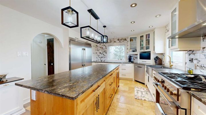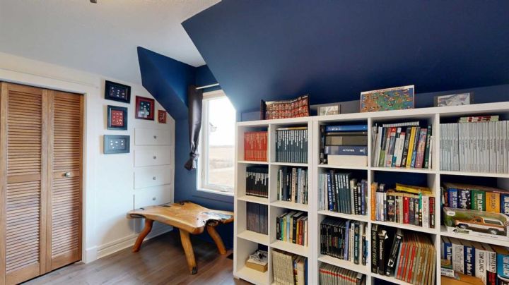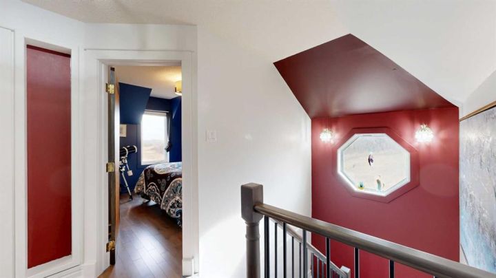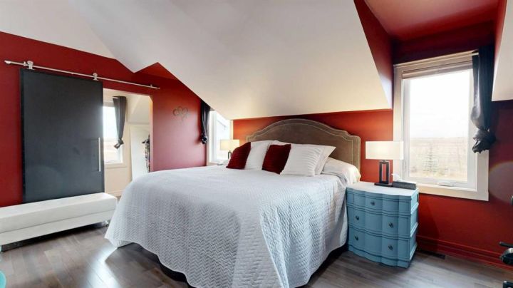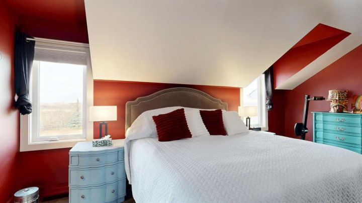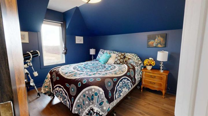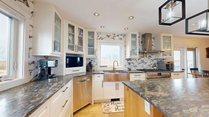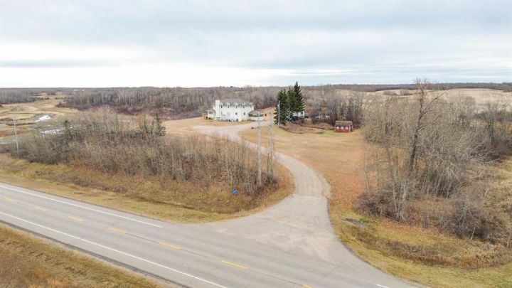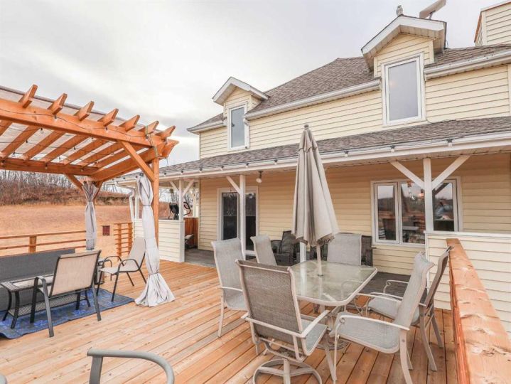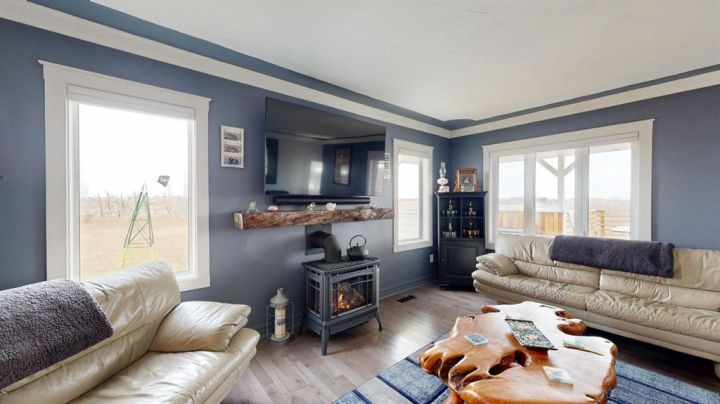 This iconic home is well known for its classic character, hilltop setting, and prime location along Highway 11. Ideally positioned between Stettler and Red Deer, this acreage offers the perfect blend of peaceful country living with an easy commute—pavement right to your driveway making travel easy year-round. Beautifully transformed through a comprehensive renovation, this home blends modern luxury with original architectural charm, and nearly everything has been upgraded to create a truly exceptional living space that is perfect for families, acreage owners, and anyone seeking a standout country home. A charming enclosed porch welcomes you at the main entrance, offering the perfect space to greet guests and enjoy morning coffee. The chef-inspired kitchen is sure to impress, featuring leather granite on the counters and an 8’7” island, high-end appliances including a full-height fridge and freezer and dual fuel range, soft-close drawers, and appliance garages to keep everything neatly tucked away. The kitchen opens to the dining room, where patio doors lead to the deck for seamless indoor-outdoor living and entertaining. The spacious living room exudes warmth and comfort with a new gas fireplace/stove and a live-edge mantle. A convenient main floor office also offers patio doors to the veranda, making it ideal for working from home. The spa-like three-piece bathroom includes leather granite and a walk-in shower, while the large laundry room features high-end steam washer and dryer and a laundry chute. Upstairs, the home’s original character shines through with the classic octagonal window, decorative panels on the bedroom doors, and a cozy reading nook at the top of the stairs. The primary bedroom includes a walk-in closet and a luxurious five-piece ensuite with a solid wood vanity counter, jet tub, walk-in shower, and a private water closet. Three additional bedrooms offer beautiful views overlooking the property and surrounding landscape. The four-piece bathroom features travertine flooring, a leather granite countertop, and a custom tub and shower. The basement is a blank slate awaiting the vision of the new owner, offering plenty of potential for development. The property offers expansive views, including scenic wetlands to the east, which can be enjoyed from the veranda or deck. Upgrades have been done in the last two years and include travertine and maple hardwood flooring, windows on the main and upper level, blinds, central vacuum system, updated electrical panels in both the house and garage, R50 blown-in and R40 batt insulation in the attic, hot water tank, and central air. The large garage features updated doors, central vacuum, and a full wall of cabinetry to help keep everything organized. Whether you are raising a family, working from home, commuting for work, or simply seeking a peaceful country lifestyle with modern luxuries, this exceptional property provides a setting that is easy to fall in love with.