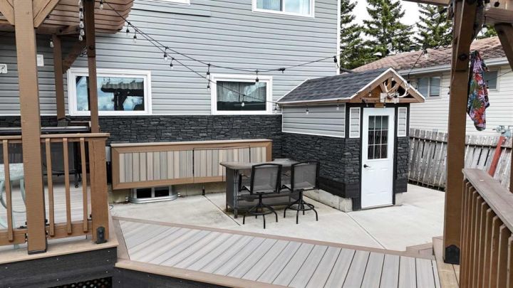 This 2 storey home sits on a massive 9000 sq.ft. lot, perfectly located close to schools, hockey arena, swimming pool, walking trails and just a short walk to downtown. The upper level features 5 spacious bedrooms and a 4 piece bathroom and 3 piece ensuite (bathrooms have been upgraded). In 2019 all new vinyl widows were instlled, adding to the homes energy efficiency and curb appeal along with new exterior finishing. The main floor offers a bright and inviting layout with a large kitchen and dining area, a formal dining room, a cozy living room with wood burning fireplace and a convenient 2 piece bathroom. The basement is an absolute showstopper - a man cave like no other. With a separate entrance, the fully finished basement includes a bar with a it up counter, fridges, a dishwasher, and a pool table which stays! You will also find a den, a 3 piece bathroom and a laundry area with two sets of washers and dryers. Step outside to enjoy two beautiful decks, both built in 2019. The first is a 16 x 16 featuring a bbq, bar area under a stylish pergola. A bridge leads to the second deck, also covered by a pergola which houses a relaxing hot tub. This second deck is engineered for durability supported by 13 piled foundations. This is a rare opportunity to owm a home with incredible indoor an outdoor entertainment spaces, perfect for family living and hosting friends.