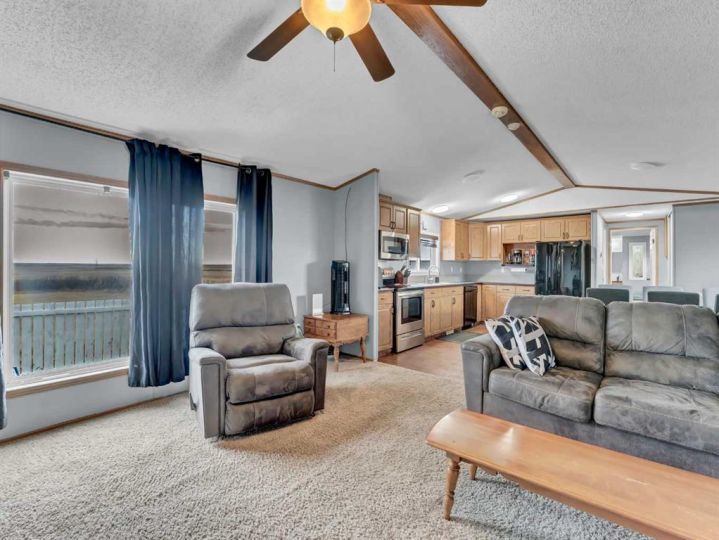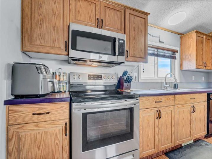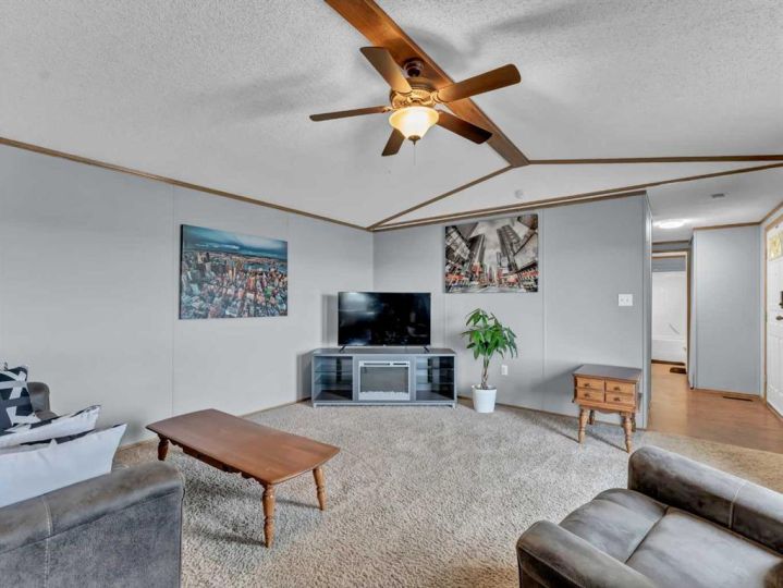 Enjoy quiet country living just minutes from Medicine Hat. This well-maintained 3-bedroom, 2-bathroom mobile home on 2.02 acres of well-drained, partially treed land with great views of the city and Dunmore. The home features an open-beam design with vaulted ceilings that sprawl the main living areas, spacious kitchen, dining and living area, with views out either side of the home and a primary bedroom with a 4-piece ensuite. It’s skirted with 6-inch insulation, Tyvek wrap, and vinyl siding, anchored with steel cables to reinforced concrete footings built to CMHC specs. The property includes all-weather crushed concrete driveway offering loads of parking, outdoor deck spaces and a manageable fenced in area for pets and kids with loads of additional land to use as you please. There’s room for kids to play, space for animals, or potential to build your dream home while keeping the mobile as a guest house. The overside garage sized at 26x28 makes for great parking and a shop with a stove heater. Located on the south side of City View Estates—just past Dunmore—this property offers great value, privacy, and convenience.