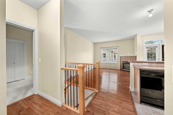 Welcome to the highly sought-after villa bungalows at Tucker Hill. This bright and welcoming 2-bedroom, 2-bathroom walkout bungalow offers the ideal blend of comfort, convenience, and low-maintenance living. As you enter, you’ll immediately appreciate the abundance of natural light and the gleaming hardwood floors that flow through the hallway, living room, and dining area. The spacious living room features a charming corner gas fireplace with an oversized mantle—an inviting place to unwind in the evenings. The well-appointed kitchen includes a built-in oven, electric cooktop, generous counter space, and a raised eating bar, making everyday meal prep easy and enjoyable. Share meals in the dedicated dining room or step outside to your low-maintenance, east-facing deck for a peaceful morning coffee or relaxed BBQ. The primary bedroom offers comfort and practicality with a walk-in closet and a 3-piece ensuite featuring a large walk-in shower with two built-in seats—ideal for ease of use. The second bedroom is spacious as well, complete with a lovely bay window overlooking the front of the home. A 4-piece bathroom with a convenient stacked washer/dryer completes the main level, ensuring you can enjoy true one-level living. Attractive maple and iron railings lead you to the walkout basement, where large windows and direct access to the covered patio provide even more bright, usable space. The unfinished lower level includes a 3-piece rough-in, giving you flexibility for future development if desired. An oversized single garage adds extra storage and easy parking. This is a wonderfully cared-for home in a quiet, friendly community—come see for yourself how perfectly it fits a relaxed, low-maintenance lifestyle.