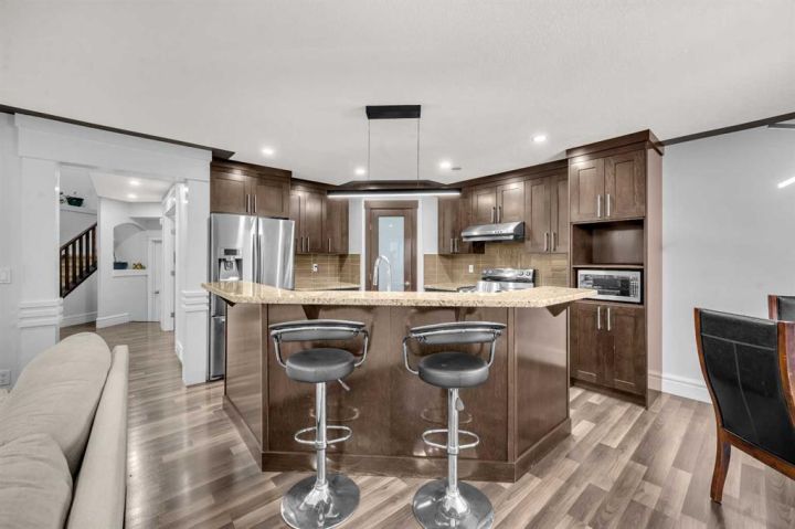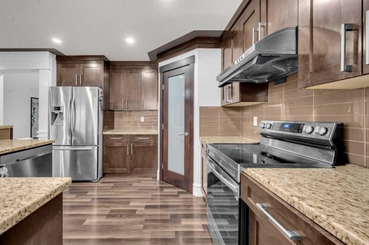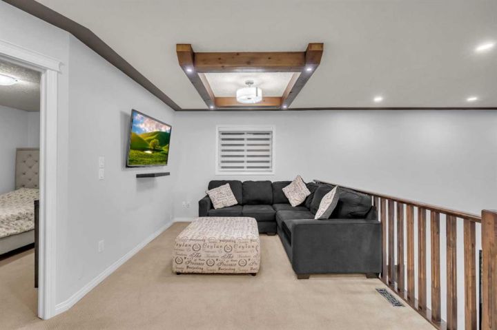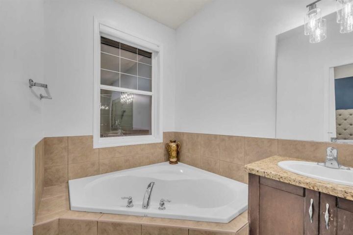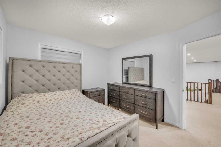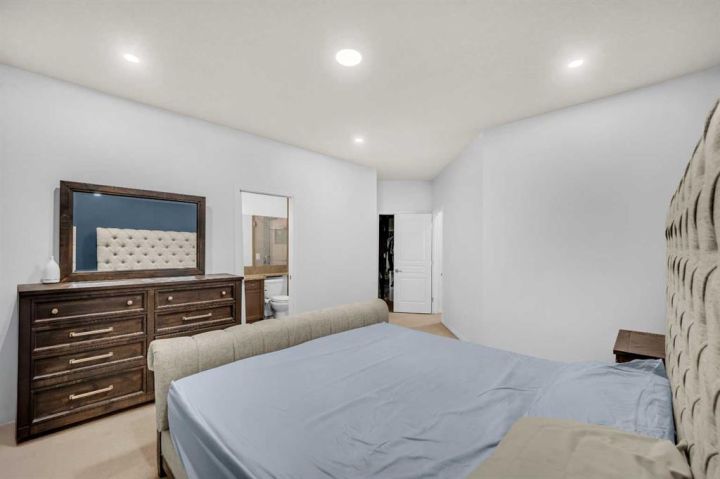Welcome to this exceptional 2-storey family home located in one of Chestermere’s most desirable areas—just a 2-minute walk to Chestermere Lake and its sandy beach, offering the perfect blend of everyday convenience and year-round lake-lifestyle living. Situated on an impressive 6,942 sq. ft. lot and complete with a triple attached garage, this home provides an abundance of indoor and outdoor space for growing families, entertainers, and anyone seeking an elevated lifestyle steps from the water. As you step inside, you are greeted by a grand and inviting open-to-below living room that fills the main floor with natural light, creating a warm and welcoming atmosphere. A cozy gas fireplace serves as the focal point of the space, making it the perfect gathering area for family and guests. The expansive kitchen is designed for both daily functionality and entertaining, featuring granite countertops, stainless steel appliances, a large walk-in pantry, ample cabinetry, and a generously sized dining area overlooking the backyard. Adjacent to the main living space is a spacious main-floor den, ideal for a home office, playroom, or quiet flex room to suit your needs. The upper level offers a thoughtfully designed layout with four bedrooms and a bonus room. The fourth bedroom has been converted into an oversized walk-in closet, providing exceptional storage and organization; however, the seller is willing to remove the built-ins and convert it back to a full bedroom before possession, making the home easily adaptable for larger families. The primary suite is a true retreat, featuring a large walk-in closet and a luxurious 5-piece ensuite complete with a relaxing soaker tub, a separate standing shower, dual sinks, and elegant finishes throughout. The additional bedrooms are generously sized, perfect for children, guests, or multi-purpose use. The fully finished basement adds even more versatility with a separate side entrance, offering excellent potential for multi-generational living or income opportunities. The basement includes an illegal 1-bedroom suite that has been tastefully updated with brand-new kitchen cabinets, new flooring, new appliances, and modern built-ins, providing a fresh and comfortable living space. In addition to the suite, the lower level features a massive recreation room ideal for a home theater, games area, or gym, along with another huge and bright bedroom. Outside, the property continues to impress with a large, fenced backyard that offers privacy, space, and endless potential for outdoor activities. The expansive deck is perfect for barbecues, gatherings, morning coffee, or evening relaxation, and even provides beautiful lake views—a rare and special feature. With central A/C, a triple garage, and its unbeatable location mere steps from the lake, parks, pathways, and schools, this home delivers outstanding value and a lifestyle that is second to none.