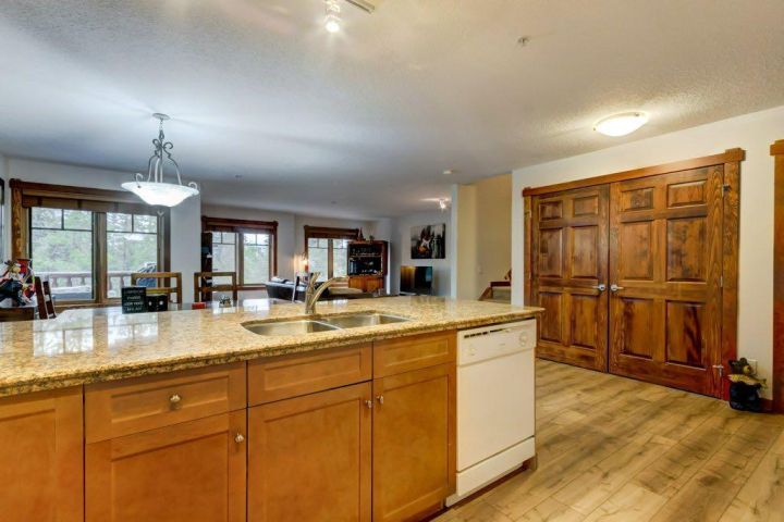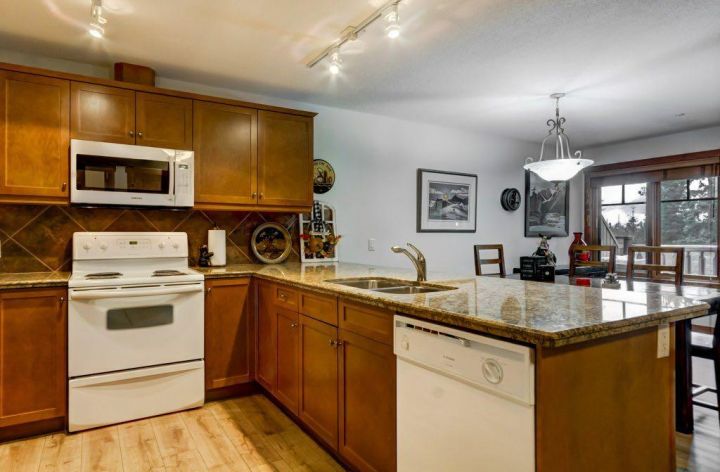 Executive Condo in Canmore’s Exclusive Three Sisters Community. Immaculately cared for two bedroom, two bathroom penthouse condo in the highly sought-after Three Sisters neighbourhood. This beautifully designed home spans two levels, featuring an open-concept main floor living area with stunning mountain views framed throughout: overlooking mature evergreen trees and the Bow River. These unobstructed views offer exceptional privacy for you to enjoy. Upstairs, two spacious bedrooms offer a quiet separation from the main living space. High-end finishes include new hardwood flooring and granite countertops throughout. This is a no-smoking, no-pet home. The property includes two titled indoor, side-by-side parking stalls, literally steps from the elevator, and two ample indoor storage units. This condo offers in-floor heating, gas fireplace and laundry room. Exterior maintenance is covered by the condo association allowing for low-maintenance living, including window and garage floor cleaning to name a few. Residents enjoy access to an exceptional amenities building featuring indoor and outdoor hot tubs, sauna, gym, weight room, pool tables, and a relaxing lounge area. A rare opportunity to own a pristine, luxury home in a peaceful mountain setting.