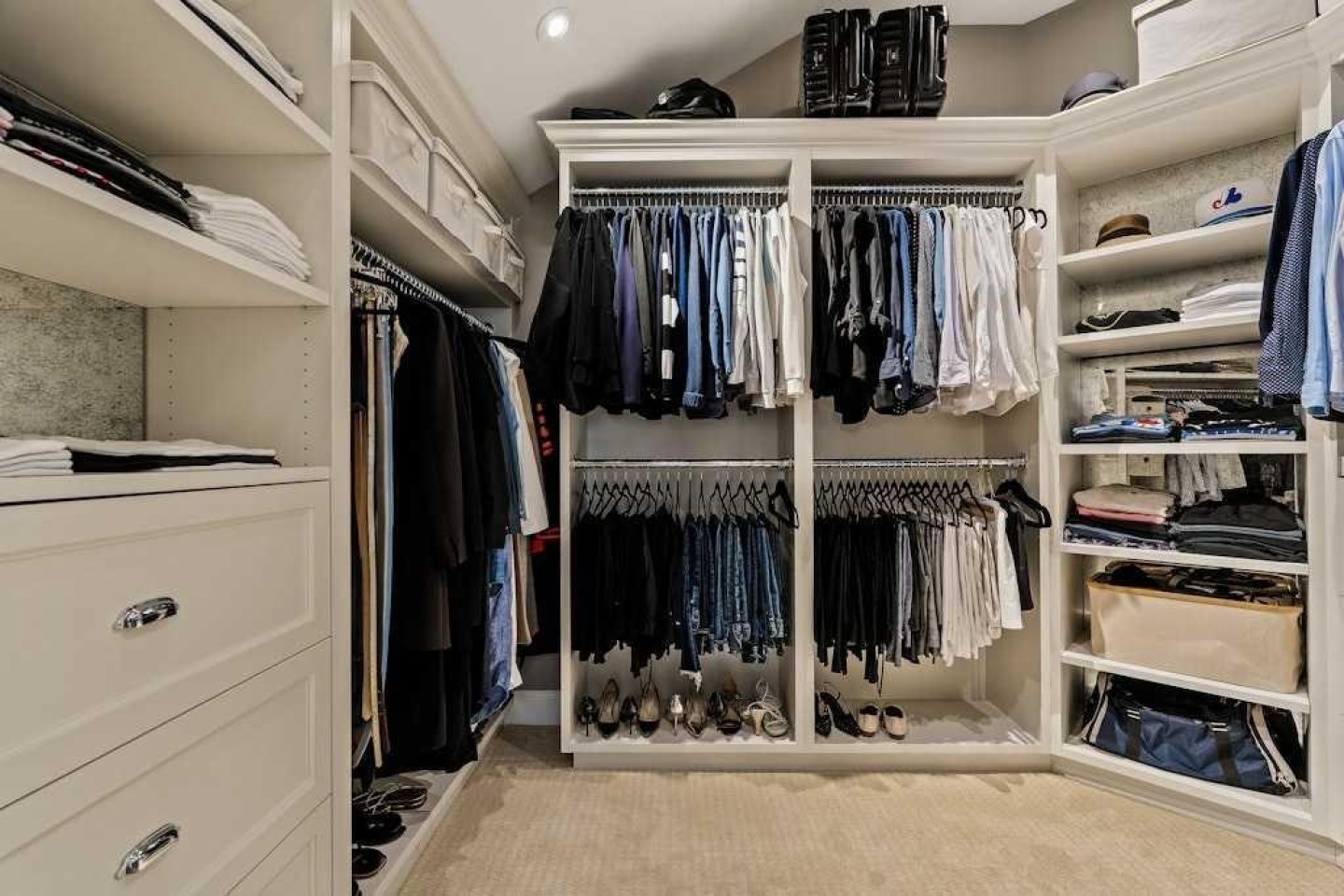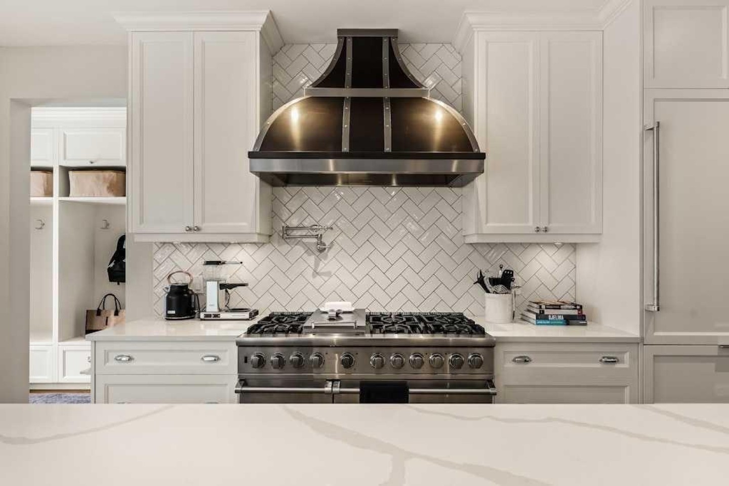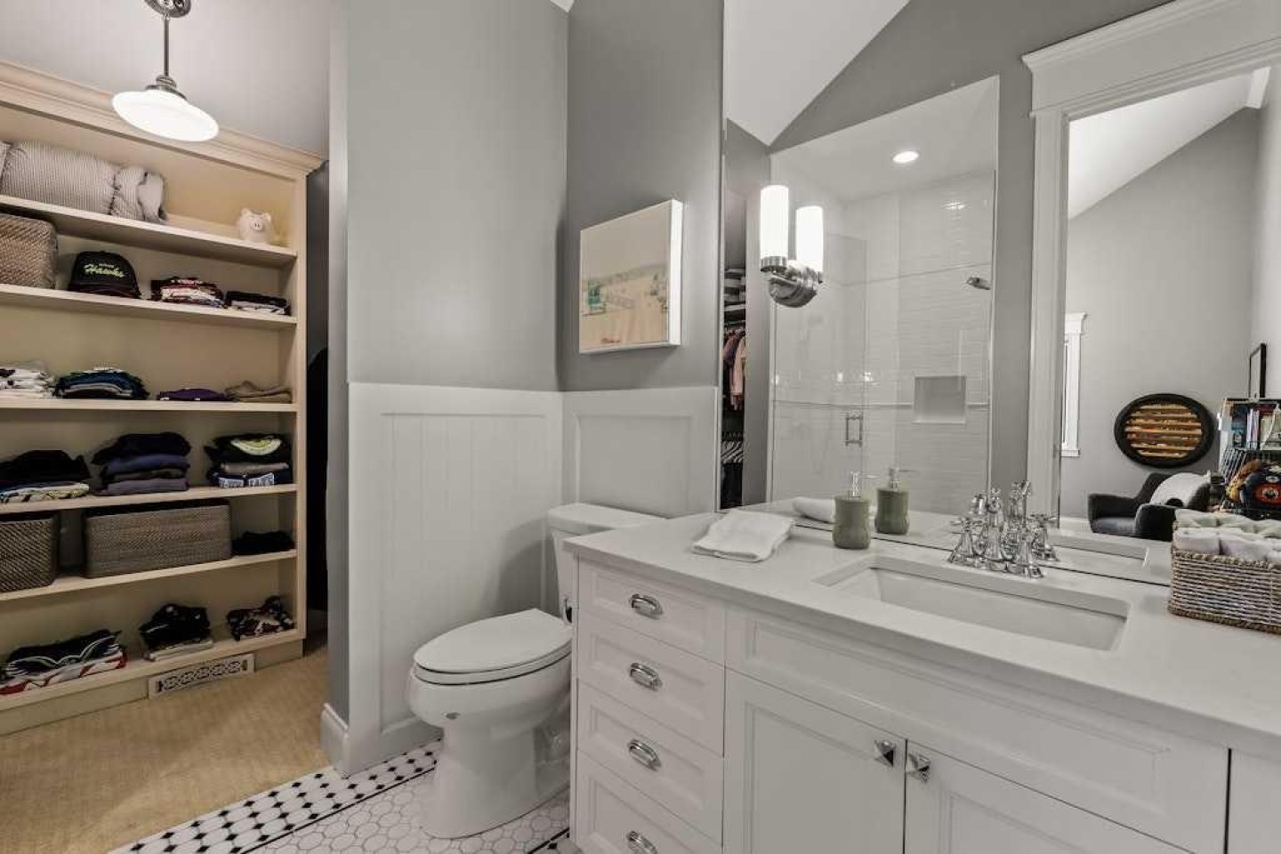 Beamed Ceilings, Bookcases, Breakfast Bar, Built-in Features, Closet Organizers, Crown Molding, Double Vanity, High Ceilings, Kitchen Island, Open Floorplan, Pantry, Quartz Counters, Storage, Vaulted Ceiling(s), Walk-In Closet(s), Wet Bar