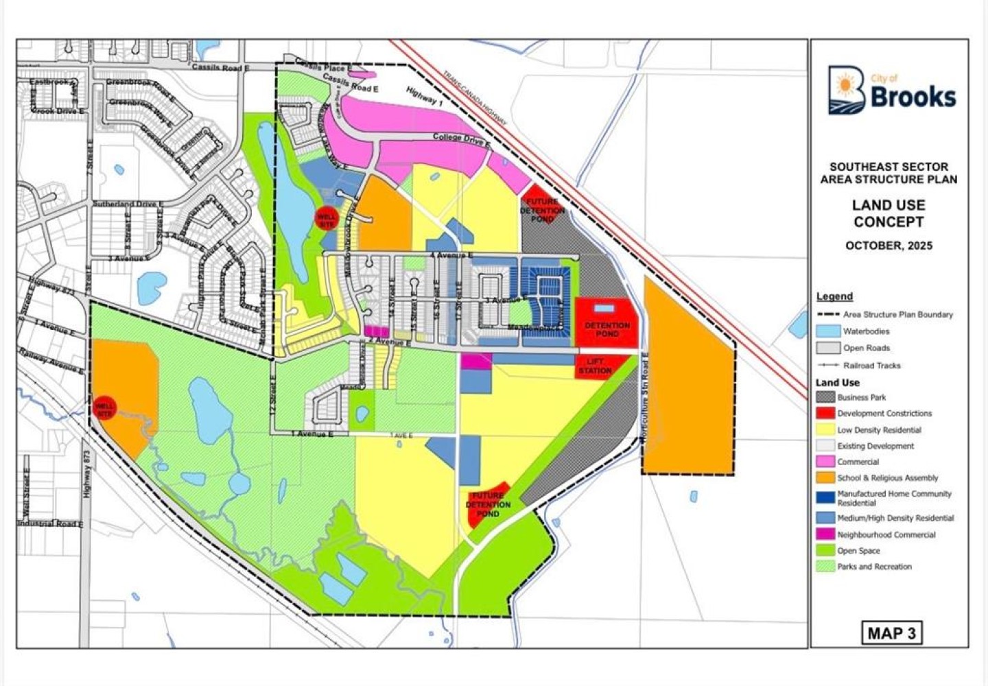 Prime 70.85 Acre Development Opportunity in Brooks. Seize this exceptional opportunity to develop 2 parcels totaling 70.85 acres of prime commercial, residential and multi-family land, strategically located on the south side of Highway 1 in the vibrant City of Brooks. Boasting Direct Control (DC) zoning, this property offers unparalleled flexibility, allowing for a wide variety of residential and commercial uses with a new Southeast Area Structure Plan now in place within the City of Brooks. Whether you envision a thriving mixed use community, commercial hub, or diverse residential development, these parcels are poised to accommodate your vision. Ideally situated near key amenities, including the Francophone School École Le Ruisseau, Medicine Hat College (Brooks Campus), and the established Meadowbrook residential neighborhood, this property is primed for growth. With its close proximity to Highway 1, it offers excellent visibility and accessibility, making it an attractive option for developers and investors. The surrounding area is experiencing new growth, presenting a strong market for both residential and commercial developments. Residential opportunities include single family homes, multi-family complexes, or a combination of both to cater to the needs of this thriving community. Additionally, the potential for commercial development ensures the creation of a well rounded and sustainable space. City of Brooks sewer lines run through this parcel. Explore the flexibility of Direct Control zoning and review the land-use bylaw and Southeast Area Structure Plan available in the supplement section of the listing for more details. Don’t miss out on this rare chance to shape the future of Brooks in a prime and expanding location!