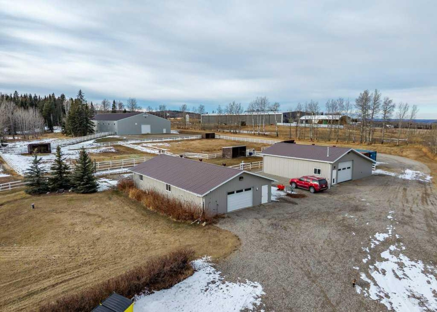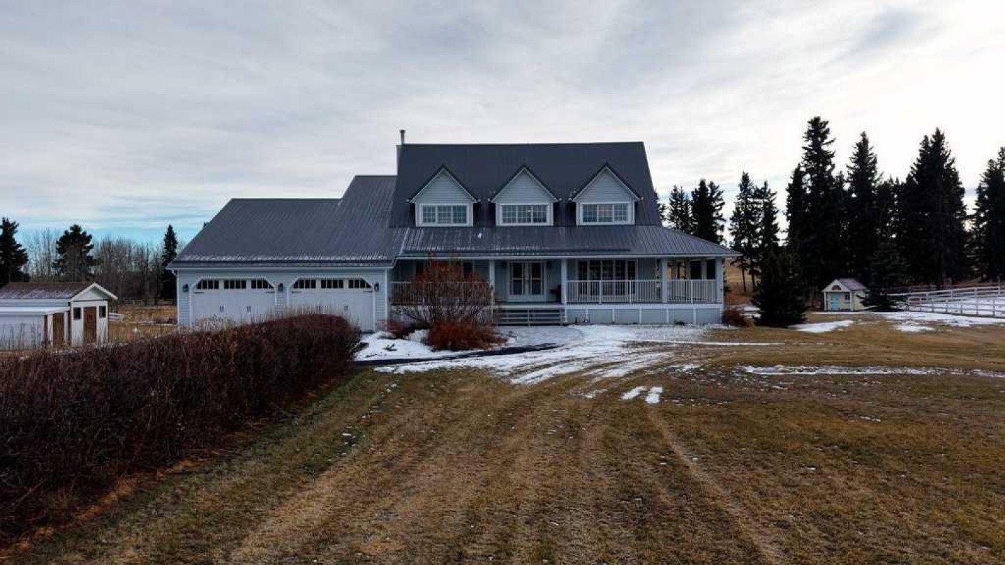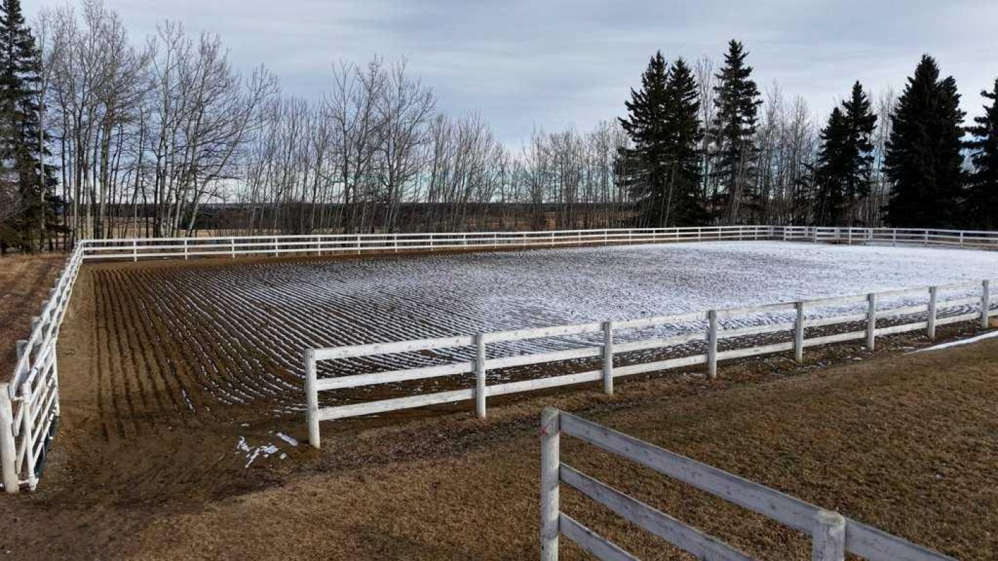 WHISPERING GROVE RANCH || TURN-KEY EQUESTRIAN OASIS Set against a breathtaking backdrop of mature forest & open pasture, this thoughtfully designed 43-acre equestrian estate just west of Bergen offers an exceptional blend of privacy, functionality, and natural beauty. The landscape features treed riding trails, practical paddocks, indoor & outdoor training facilities and a beautifully landscaped yard. A gated entrance creates a strong sense of arrival and provides security, opening to a well-planned yard with ample space for trailers, parking, and turnaround. At the heart of the property is the impressive 84’ x 180’ indoor heated riding arena constructed to commercial standards with premium, dust-controlled footing. South-facing windows provide excellent natural light, while small and large overhead doors, a stripping chute, return alley, spacious tack-up area and spectator viewing deck make the setup ideal for roping and cowhorse work. The heated five-stall barn is equally well appointed with rubber-coated floors, rubber-matted stalls with safety-built walls, and a large tack room featuring a unique 360-degree revolving tack door for efficient daily use. Outdoor facilities include a professionally graded 110’ x 170’ outdoor arena beautifully sheltered by trees, a round pen, and six plank-fenced paddocks, one of which offers direct alley access to the indoor arena. The residence offers timeless appeal with a traditional layout and has been recently painted throughout. A wrap-around deck overlooks the grounds and includes a gas line for BBQs, while the lower patio—wired for a hot tub—creates a private outdoor retreat. The driveway and lower patio feature durable recycled rubber paving. Inside, the main floor includes a generous formal dining room, a spacious formal living room, and a charming south-facing sitting room with a wood-burning river rock fireplace—perfect for sun-filled morning coffees. The expansive kitchen features miles of oak cabinetry, a large island with breakfast bar, gas stove, and patio doors opening to the south deck. A boot room with main-floor laundry includes a GE Profile 2-in-1 washer/dryer combo and provides access to the oversized heated double attached garage. Upstairs are four bedrooms, including a massive primary suite. The fully developed basement with in-floor heat offers a media room, bar area, flex space for a gym or games room, and a fifth bedroom. Additional amenities include a 30’ x 56’ heated and insulated shop, RV gravel pad overlooking a picturesque pond, secluded she-shed and firepit area, and an impressive chicken coop with enclosed outdoor run, divided hen house, and automatic door. The property features a strong drilled well (5 GPM when last tested) and a whole-house reverse osmosis system. This is a rare opportunity to acquire a fully turn-key equestrian estate in an extraordinary forested setting—perfectly suited for ropers and discerning buyers seeking privacy, quality, and a complete rural lifestyle. GST applicable.