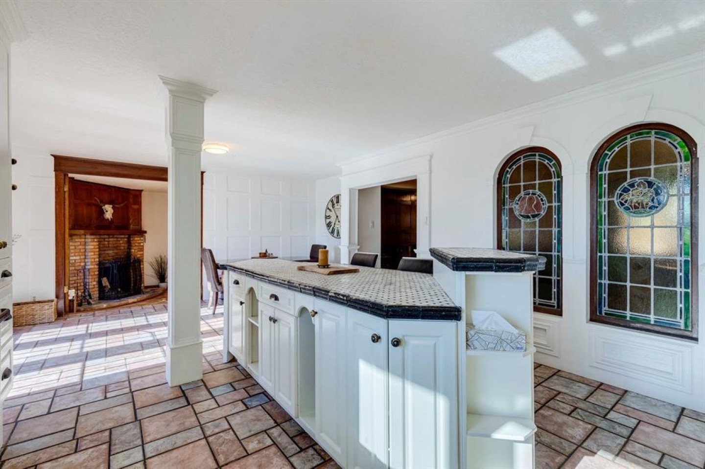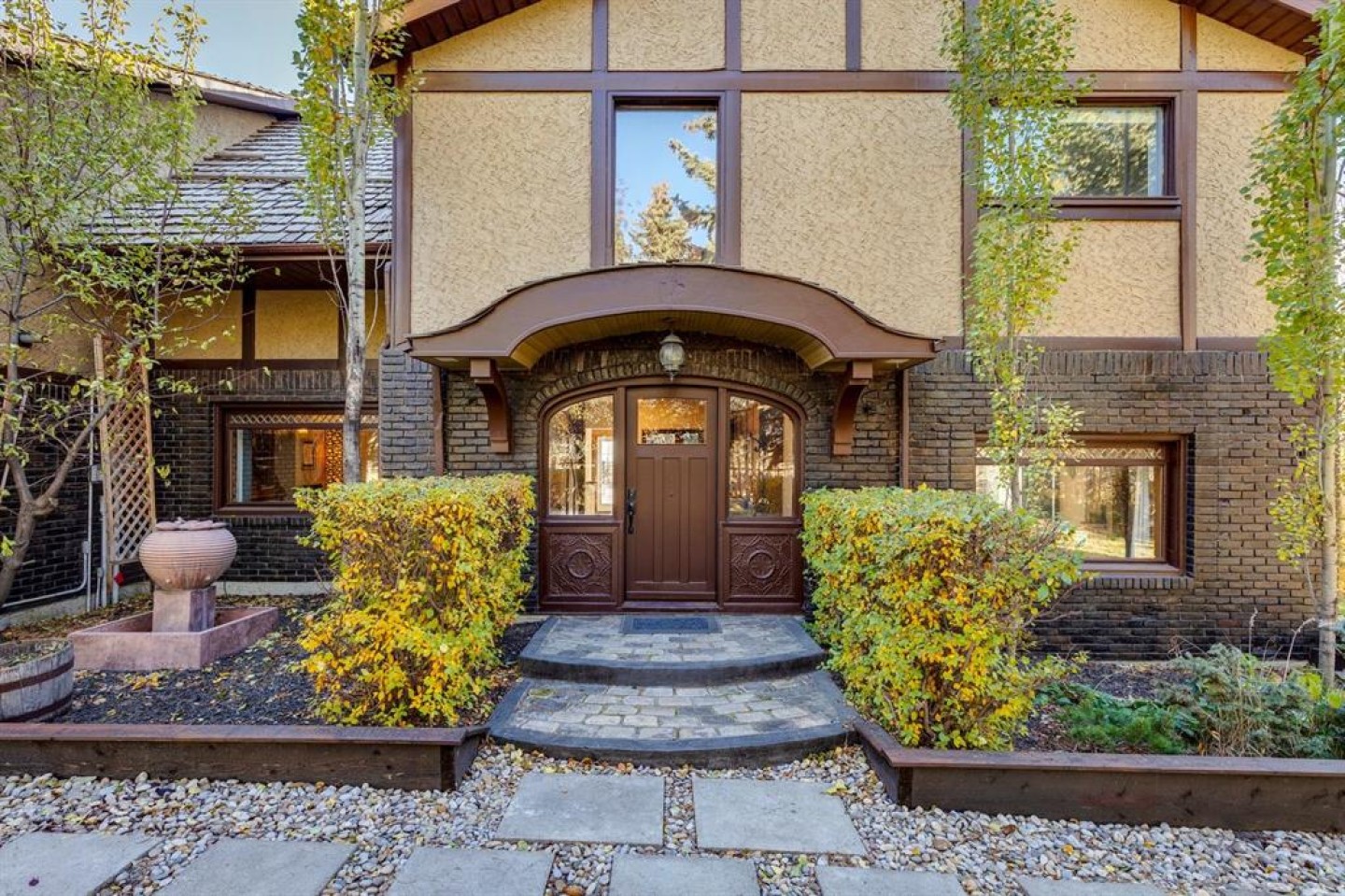 Welcome to #53 Croxford Estates NE in Airdrie, Alberta — a storybook acreage tucked into the heart of the countryside, just minutes from city conveniences. This classic Tudor-inspired country home is a rare and remarkable offering, blending old-world craftsmanship with the serenity of a private, tree-lined oasis. Set on an impressive 4 acres, this property is truly something you need to experience in person. A private, winding driveway welcomes you home, framed by mature trees and lush landscaping. Backing south, the setting captures sweeping country views, distant mountain vistas, and the unique beauty of erratic glacier rocks that add natural character and history to the land. A natural pond, established walking trails through wooded areas, and a historical rock site create an outdoor playground where kids can explore and memories are made for years to come. The stucco and brick exterior sets the tone for the timeless charm found within. Custom crafted with antique detailing throughout, this Tudor-inspired residence showcases exceptional craftsmanship. French doors, crown moulding, custom wainscoting, and a stunning giant barn door leading into the living room all add to the home’s distinctive personality. The living room is anchored by a breathtaking floor-to-ceiling brick wood-burning fireplace, creating a warm and inviting space with “windows of Mother Nature” in every direction. Unique church-style stained glass windows add character and elegance to the main level den/office/library — an inspiring space for work or quiet reflection. The bright, open kitchen features granite countertops, abundant cabinetry, and beautiful sightlines to the outdoors. Tiled and hardwood floors span the main level, complemented by in-floor heat and a reliable boiler system for year-round comfort. A huge main-level laundry room offers practicality without compromising space. Upstairs, you’ll find four generous bedrooms, including an expansive primary retreat complete with a private south-facing balcony — the perfect place to take in morning sunrises or evening sunsets over your own countryside escape. Outdoor living here is simply exceptional. An inviting outdoor pool, expansive deck spaces, outdoor BBQ area, greenhouse, storage sheds, gravel parking pads, and even your own impressive erratic glacier rock create multiple areas to relax, entertain, or simply unwind in nature. The double attached heated garage and separate gated entrance provide excellent flexibility for a home-based business, additional parking, or RV storage. With school bus service right to the driveway and schools & amenities just four minutes away. This property offers the rare opportunity to live close to the city while enjoying the privacy and tranquility of a country estate. This is more than a home — it’s an absolute treasure with an undeniable WOW factor. Come experience everything this extraordinary acreage has to offer.