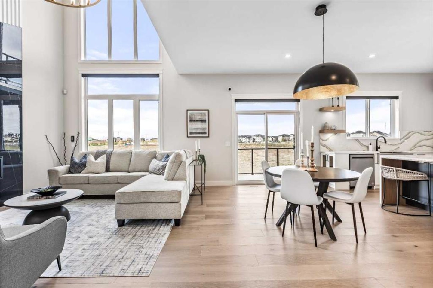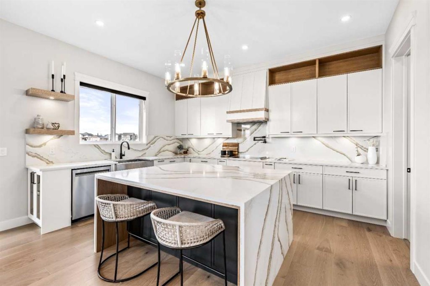 Nestled in a serene lakeside community, this exquisite 2-storey Show Home features 6 bedrooms, 5 full bathrooms, and a fully finished basement on a premium lot. The main floor boasts 10-ft ceilings, hardwood flooring, quartz countertops, a living room with feature wall, a den/office, a spice kitchen with gas range, hood fan, fridge, and dishwasher, plus an upgraded main kitchen with waterfall island and built-in KitchenAid appliances. The open-to-below in the family area showcases a natural gas fireplace, striking staircase with glass railings and sensor-activated lighting. Upstairs offers a bonus room with fireplace, laundry with sink, a luxurious primary bedroom with 6-piece ensuite and private balcony, two bedrooms with Jack & Jill bath, and a fourth bedroom with common bath. The basement includes side entry, rec room with fireplace, gym, wet bar, two bedrooms, and full bath. A triple-car garage, extended exposed aggregate driveway, and glass-railed deck completes this stunning home.